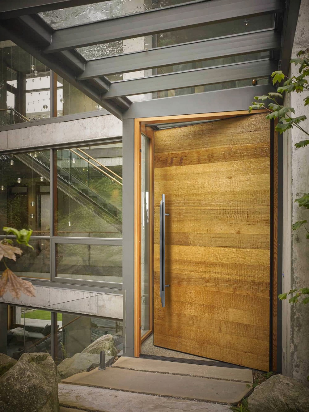 In this ultra-modern home entrance, one can find a variety of design styles, from the contemporary aesthetic of the door and flooring to the tropical nature of the location, not to mention the mid-century modern allure of the exquisite Brubeck door pull that adorns this entrance.