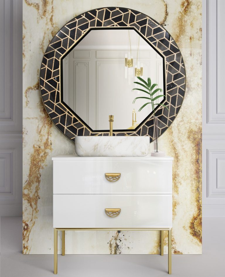 The best interior design tip the attention to detail. Every inch of your décor counts. Even the ‘jewels’ we choose for your high-end furniture pieces! The beautiful round mirror also reveals the lighting solution for this bathroom décor and it couldn’t be more appropriate.
