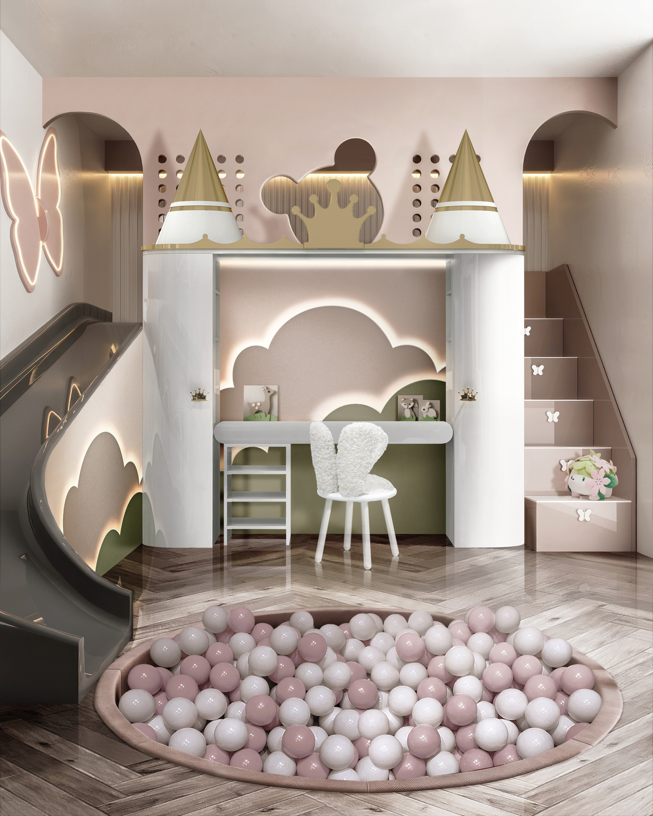 Cloud Dancer embodies a “fresh start,” offering a reset for interiors, emotions, and creative spaces alike. For design professionals, it represents an opportunity to rethink aesthetics, moving away from bold, intense colors in favor of a soft, minimalist approach that prioritizes light, space, and atmosphere over showy tones. This playful kid’s bedroom features an abundance of white, with Butterfly handles that perfectly complement Pantone’s color of the year.