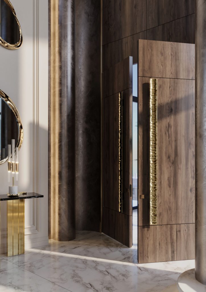 Sculptural accents turn functional elements into works of art. Decorative hardware now embraces bold volumes, organic curves, and architectural forms that capture attention without overpowering the space. This trend is impossible to ignore, elevating doors, cabinetry, and furniture through expressive design and meticulous craftsmanship. The Duorum handles, for example, bring a sculptural presence to the closet island in this luxurious interior, seamlessly merging character with functionality.