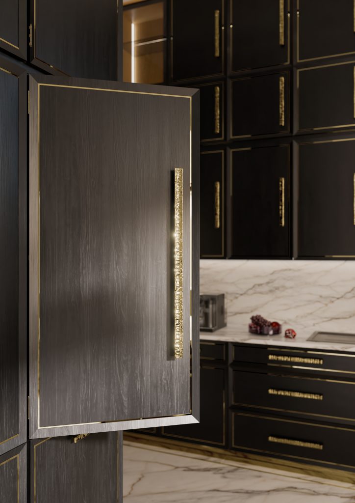 Complementary metals are redefining interior hardware, especially in spaces like kitchens. Here, the polished details of the Tiffany Marble and Quantum handles perfectly complement the surrounding environment, making it feel distinctive and refined.