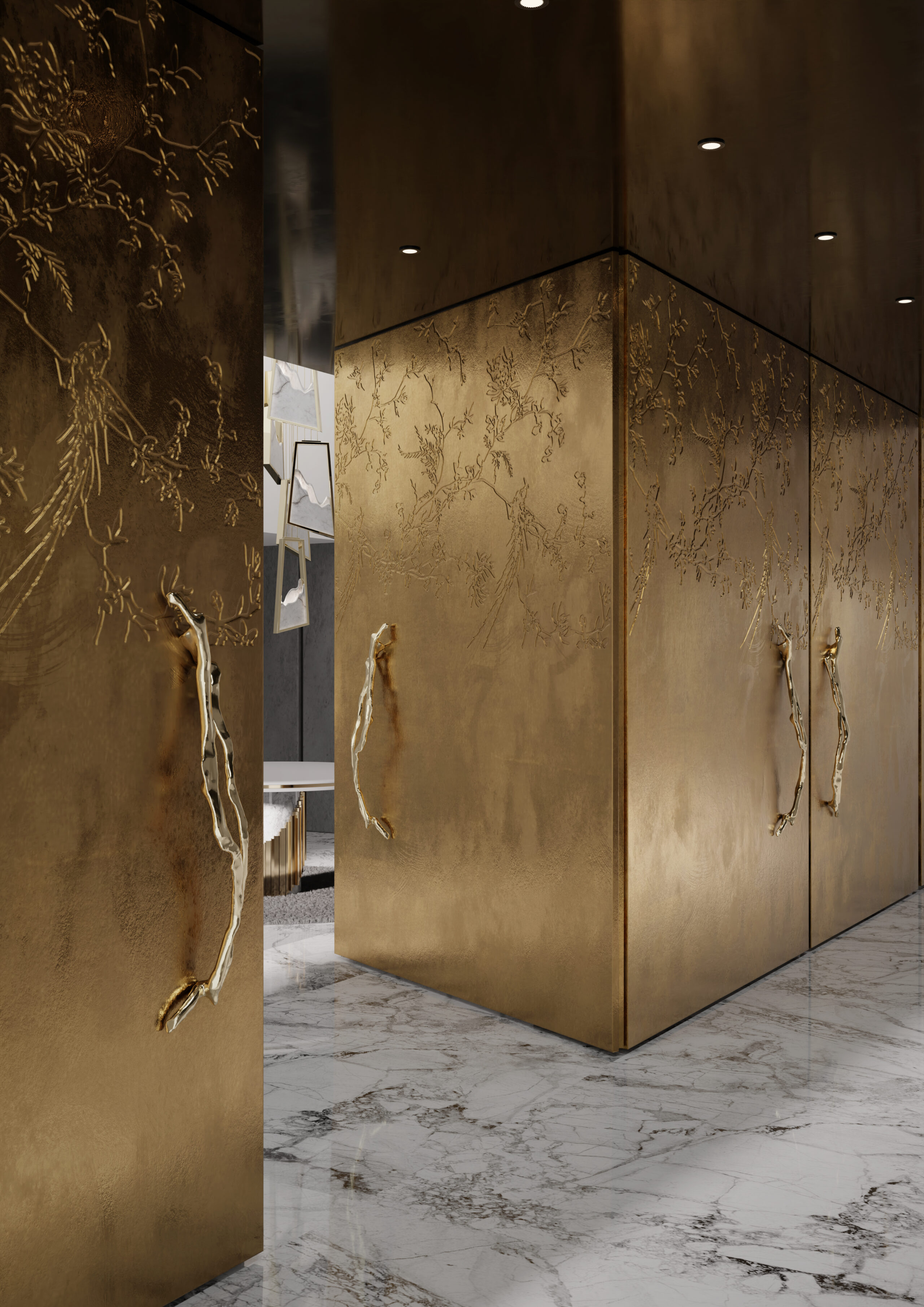 Spring always brings a craving for natural elements. Think earthy tones, organic shapes, and materials like wood, stone, or metal with a raw finish. Decorative hardware embraces this with leaf-shaped pulls or hammered textures that mimic natural wear. In this interior, the engraved patterns on the golden doors resemble delicate tree branches and the Flow door pull brings an organic touch. This combination allows for a natural sense with a fluid aesthetic while still having that much-desired luxurious feel.